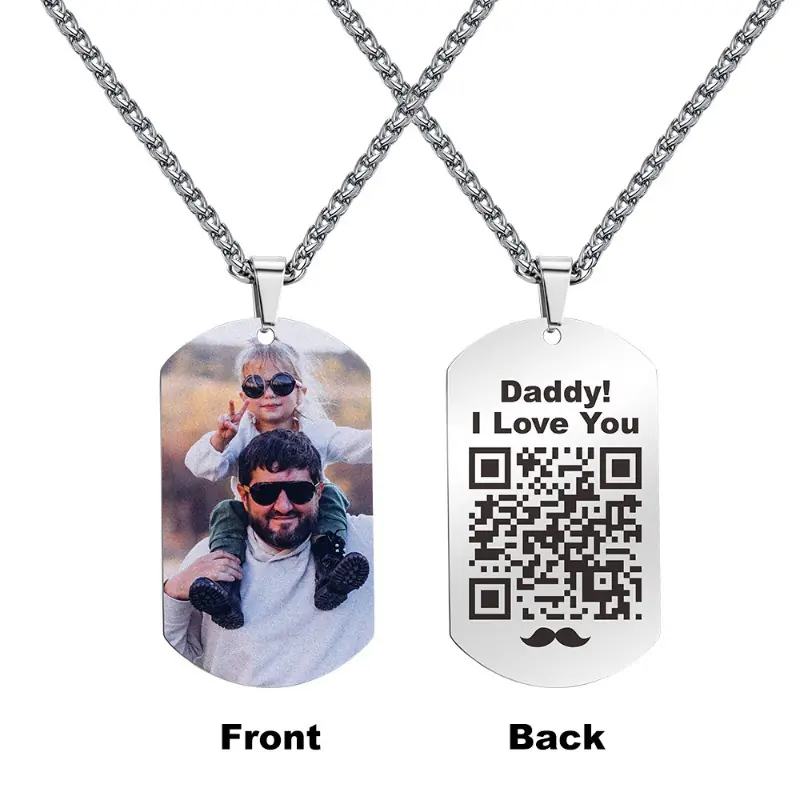 Scannable QR Code Photo Necklace – Personalized Military Tag Pendant – Custom Engraved Message Jewelry for Loved Ones