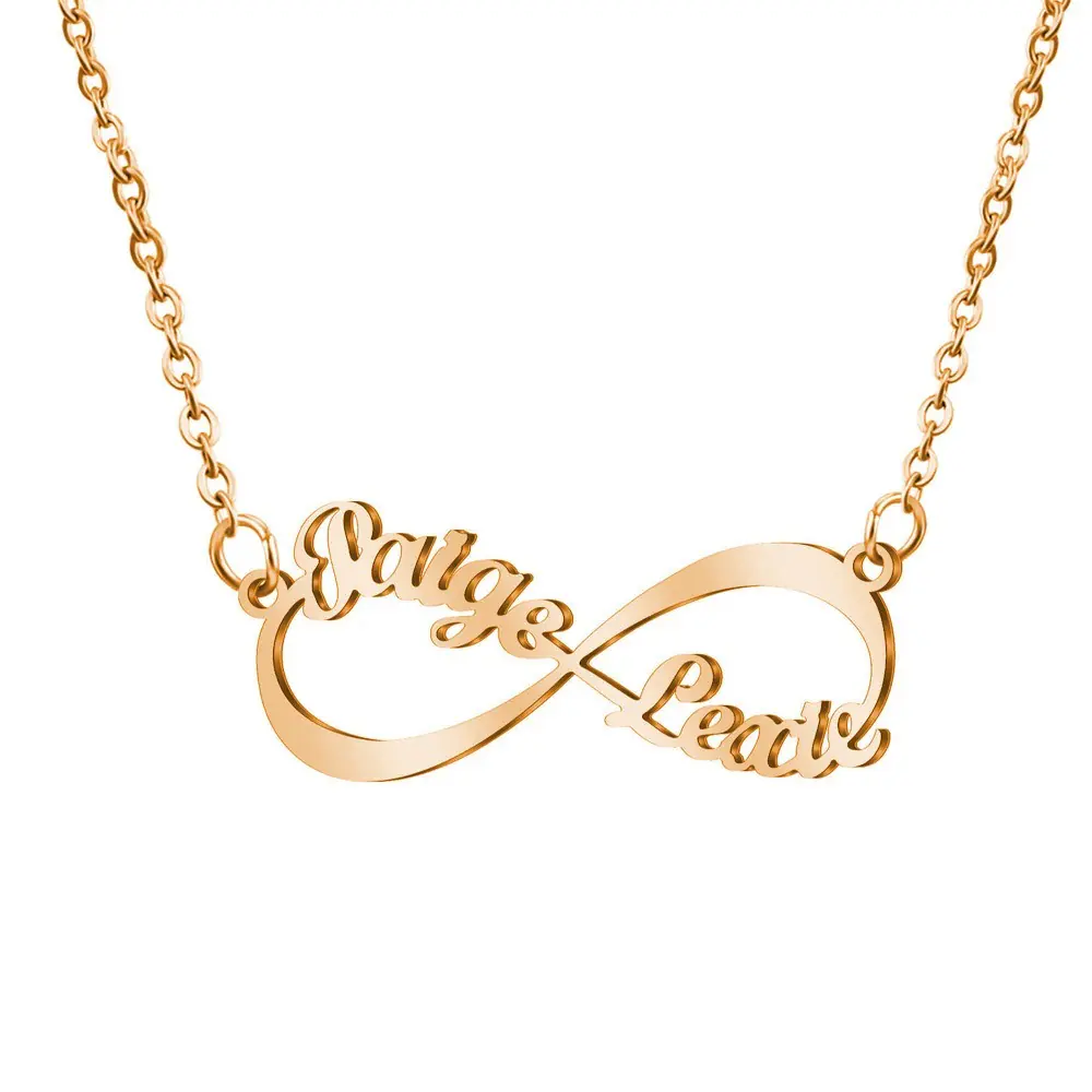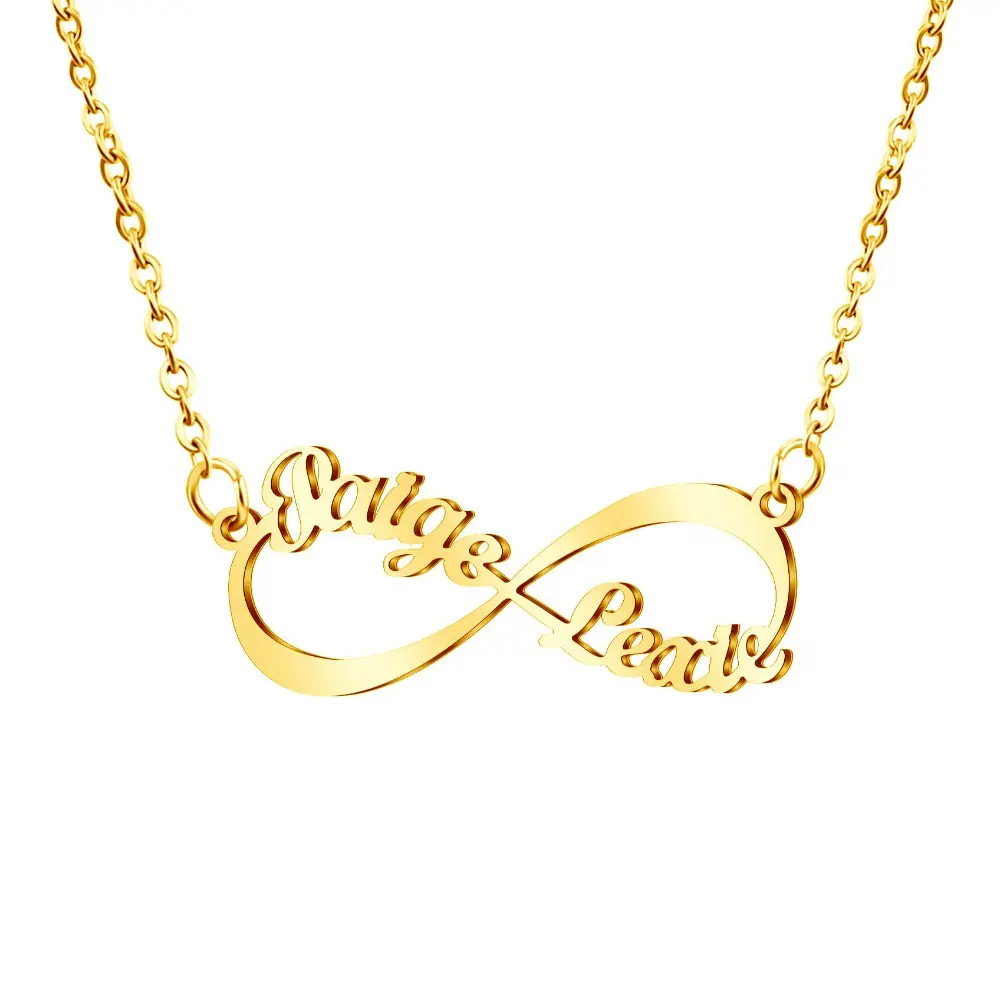 Keep the ones you love closest to your heart. Our Infinity Double Name Necklace elegantly intertwines two names of your choice within the timeless symbol of infinity. It’s more than just jewelry; it’s a beautiful representation of a bond that knows no end.